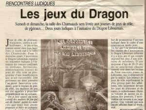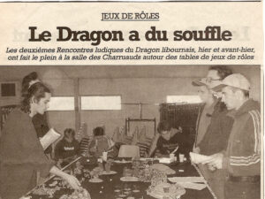 Les ancêtres allèrent battre d’autres chemins professionnels et personnels et de jeunes personnes, pleines d’envie de découvertes ludiques les remplacèrent. Première initiation au Grandeur Nature, premières parties de Jeu de Rôles, premières batailles fantastiques de figurines, première convention bordelaise auprès des Mages Mallows (qu’ils soient mille fois bénis !) s’enchaînèrent jusqu‘en 1992. De nombreux changements de situations des membres de l’association provoquèrent l’endormissement du Dragon Libournais alors en manque de membres et donc d’actions…